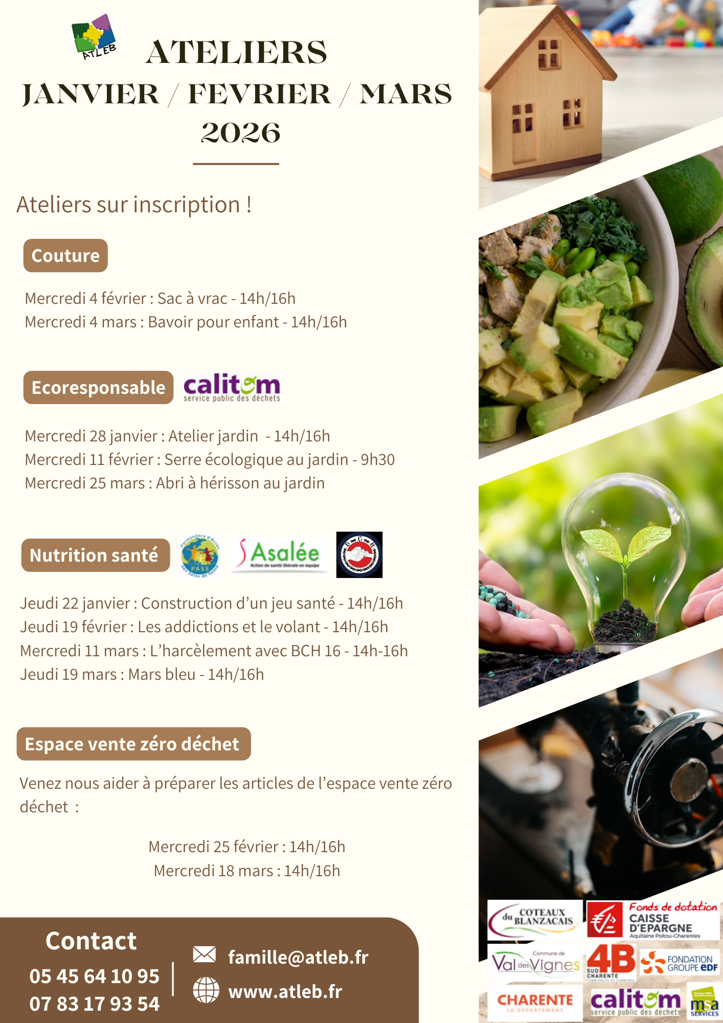 Ateliers du Tiers-lieu Janvier/Février/Mars 2026 Le jeudi 29 Août 2024 à 10h26 AM Les categories associées : Centre de Loisirs, Vie associativeNous contacterUrgences et gardesDroits et démarchesAgendaTravauxPatrimoinePartager :